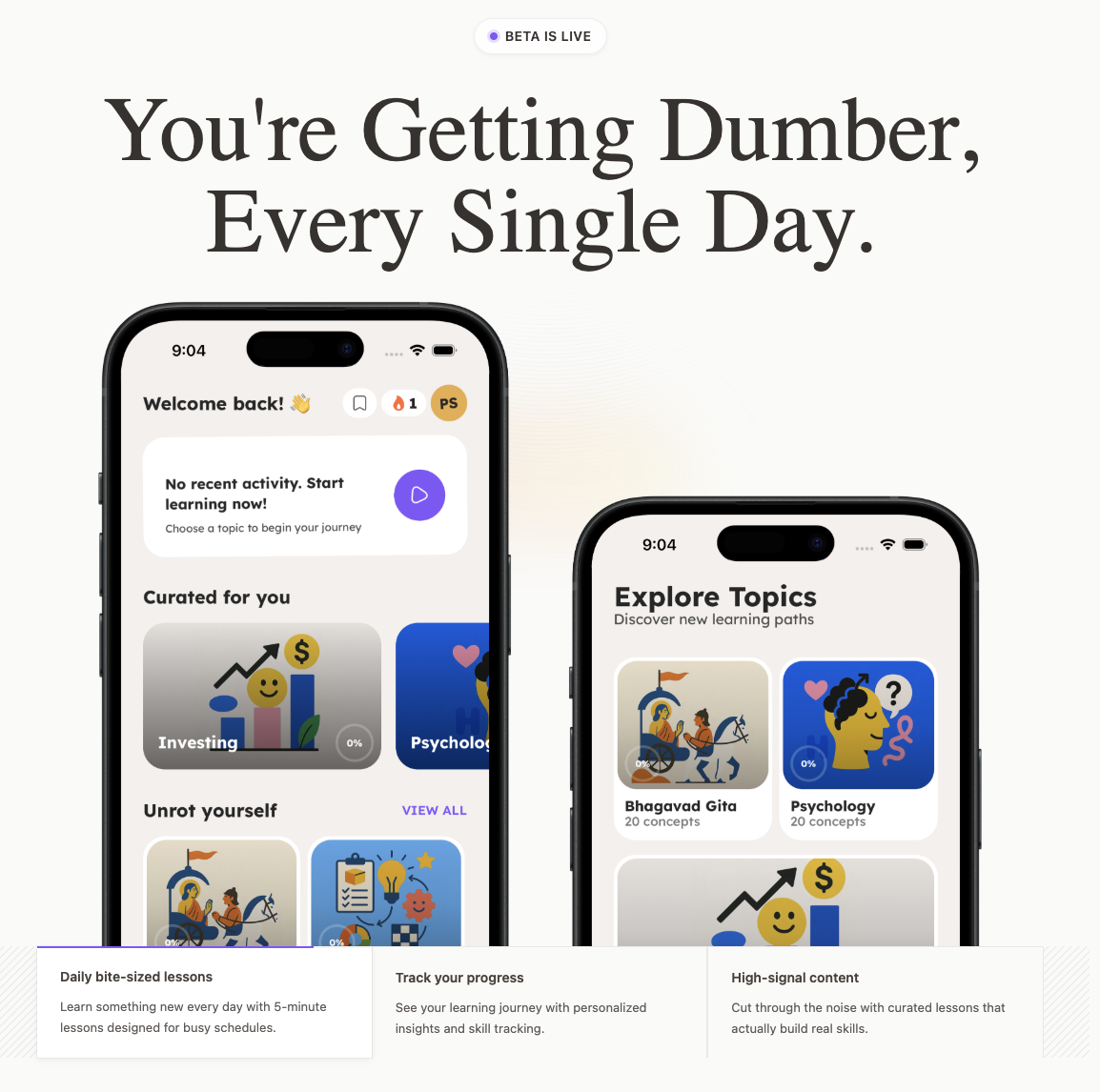 Unrot is a micro-learning app that helps busy professionals and students learn real skills in 3-minute lessons using quizzes and mobile-first design.