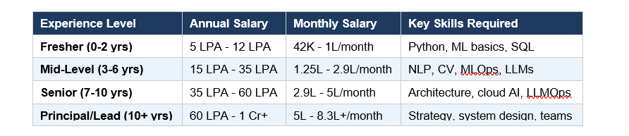 The realistic timeline: Freshers who start at 8-12 LPA in 2026, specialize in LLMs or GenAI systems, switch companies twice in 5 years, and contribute to a recognized open-source project can realistically hit 40-60 LPA in 5 years. The 1 Crore mark typically requires 10+ years, a leadership role, or a BigTech offer.