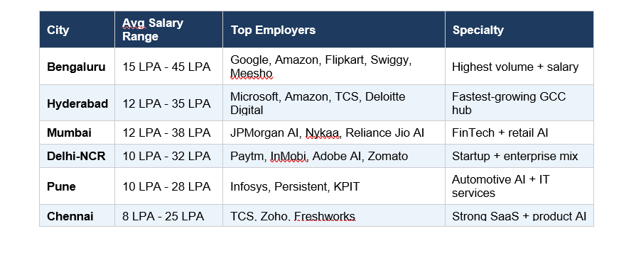 • Bengaluru: 15-20 LPA+ per annum. Top employers include Google, Flipkart, OpenAI India, Microsoft Research, Accenture AI