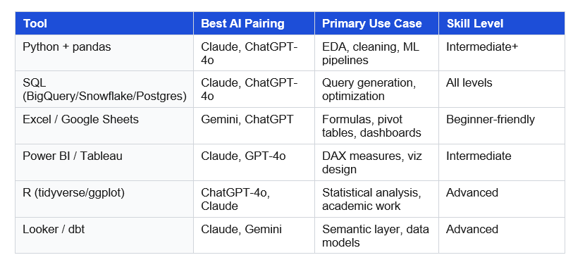 The most common tool stack includes: SQL (BigQuery, Snowflake, or Postgres) for extraction; Python with pandas, matplotlib, and scikit-learn for analysis; Tableau, Power BI, or Looker for dashboards; and Excel or Google Sheets for ad-hoc analysis. AI tools — ChatGPT, Claude, and Gemini — are increasingly integrated into each of these for code generation, formula writing, and communication drafting. The comparison table in Section 2 of this guide maps which AI pairs best with each tool.