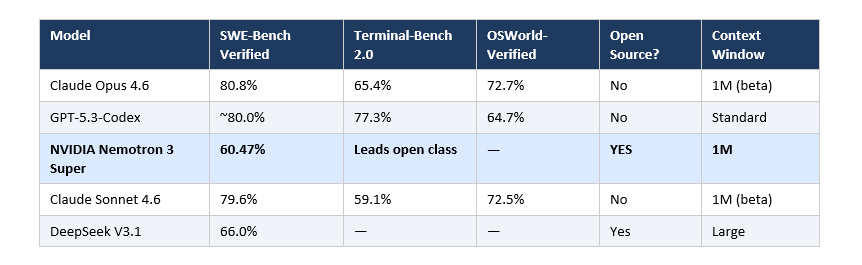 • Data privacy requirements: Many enterprises cannot send proprietary code to any external API. For these teams, Nemotron 3 Super is not just cheaper, it is the only viable frontier option.