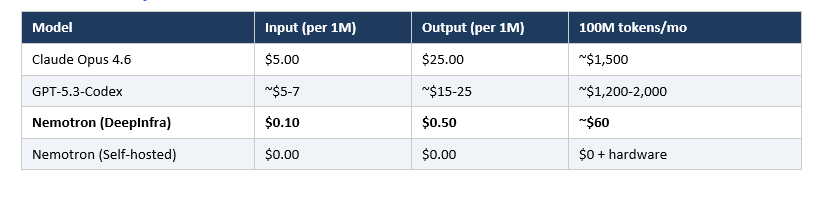 The reason is economics. A team running 50 coding tasks per day on Claude Opus 4.6 at $5 per million input tokens and $25 per million output tokens accumulates real costs fast. GPT-5.3-Codex pricing is in a similar range for paid users. Nemotron 3 Super via DeepInfra API runs at $0.10 per million input and $0.50 per million output tokens. That is roughly 10-50x cheaper per token before you even consider self-hosting.