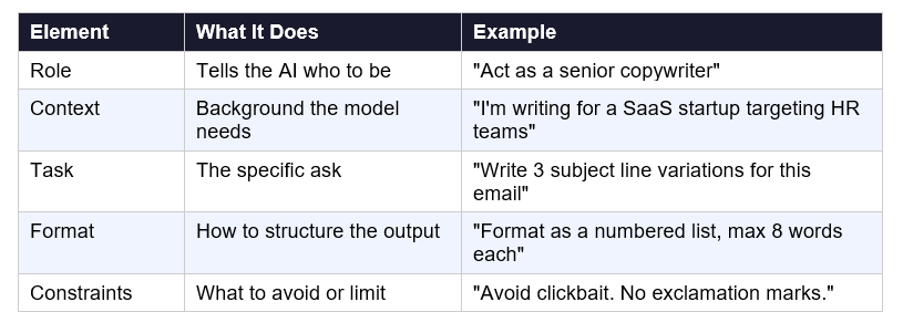 My honest take: you don't need all five elements in every prompt. But you need at least three. A prompt with only the task — "write me an email" — leaves the model guessing on role, format, and constraints, and you end up editing more than you saved.