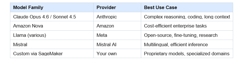 Bedrock added 30+ models in the last 3 months alone. The current lineup includes Claude Opus 4.6, Claude Sonnet 4.5, Amazon Nova, Meta Llama, Mistral, and a growing selection of open-source models. If you need a custom model that is not in the catalog, SageMaker and NovaForge let you bring your own model and host it on AWS infrastructure.