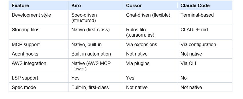 AWS Kiro is an AI-powered IDE that uses spec-driven development to produce structured, production-ready code. Unlike Cursor, which is primarily chat-driven and flexible, Kiro creates formal design documents and task breakdowns before writing code. Kiro also has native AWS MCP Server support, built-in agent hooks for automated workflows, and LSP integration for deeper project understanding.