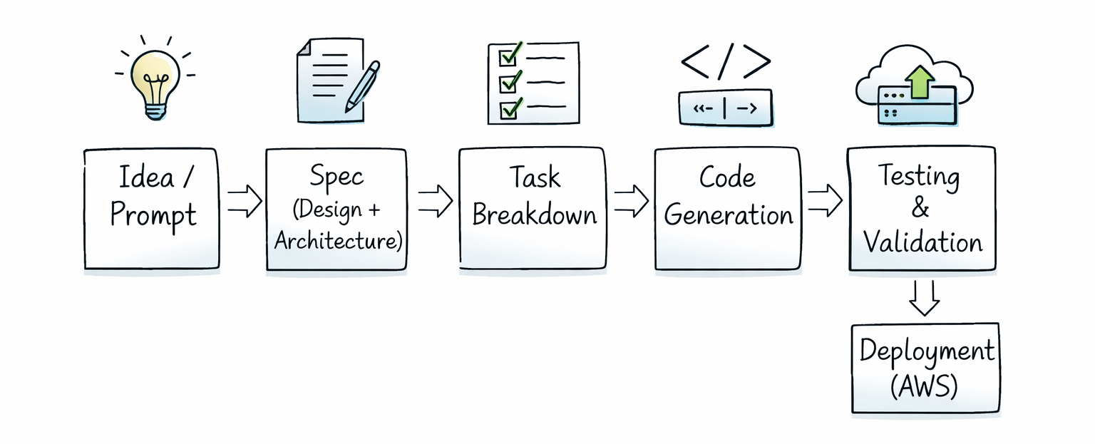 Spec-driven development is Kiro's approach to building software: instead of writing code immediately from a chat prompt, Kiro first creates a structured design document that defines goals, architecture, and tasks. It then executes those tasks sequentially with built-in verification. This produces more consistent, documented, and production-ready output compared to vibe coding alone.