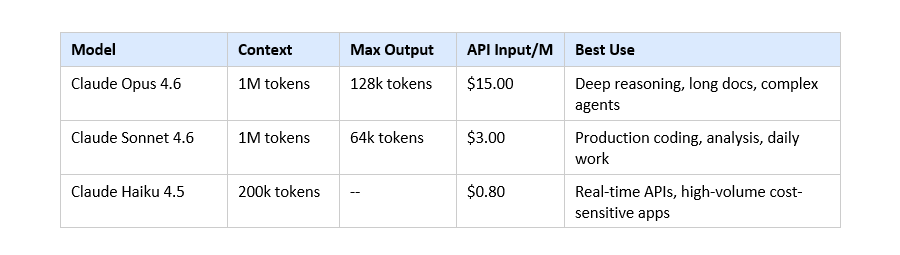 Three: Claude Opus 4.6 (1M context, 128k output, $15/M input), Claude Sonnet 4.6 (1M context, 64k output, $3/M input), and Claude Haiku 4.5 (200k context, 200+ tokens/sec, $0.80/M input). All available via claude.ai, Anthropic API, AWS Bedrock, and Google Vertex AI.