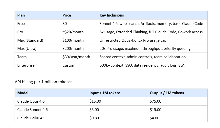 The free tier is the most competitive it has ever been. Memory, web search, Artifacts, and Sonnet 4.6 access for $0 is a serious offering. Claude Pro at $20/month with Extended Thinking, full Claude Code, and Cowork preview delivers more capability-per-dollar than any comparable AI subscription. The Max tier makes sense only for power users or professionals who run Opus 4.6 as their primary work tool.