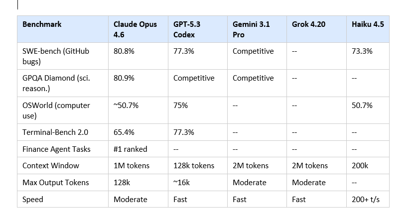 Three things I want to call out directly. First, GPT-5.3 Codex beats Claude on Terminal-Bench 2.0 by nearly 12 percentage points. That is a real gap for terminal-heavy agentic work; do not let Claude advocates minimize it. Second, both Gemini 3.1 Pro and Grok 4.20 offer 2M token context windows, which is larger than Claude's 1M. Third, on OSWorld computer use automation, Claude sits around 50% while GPT-5.4 has pushed to 75%. Anthropic appears to be making a deliberate choice to prioritize long-context quality over this specific benchmark.