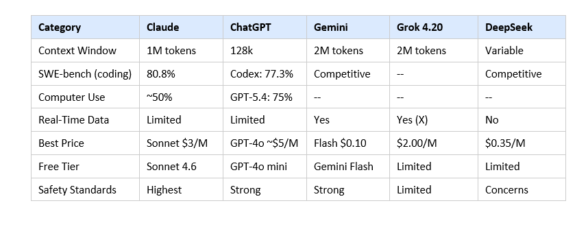 Head-to-Head: Claude vs ChatGPT, Gemini, Grok, DeepSeek