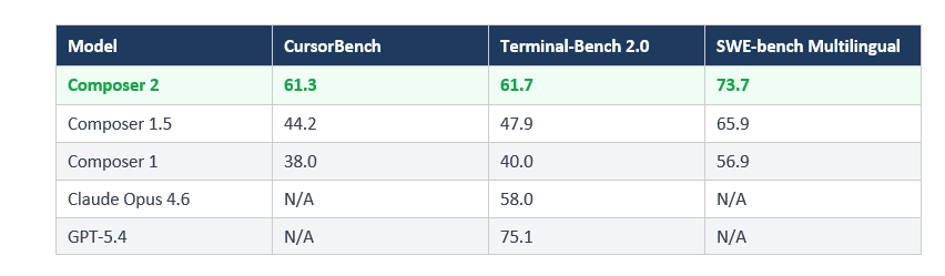 Composer 2 scores 61.3 on CursorBench (up from 44.2 for Composer 1.5), 61.7 on Terminal-Bench 2.0 (up from 47.9), and 73.7 on SWE-bench Multilingual (up from 65.9). It outperforms Claude Opus 4.6's Terminal-Bench 2.0 score of 58.0 but trails GPT-5.4 at 75.1 on the same benchmark.