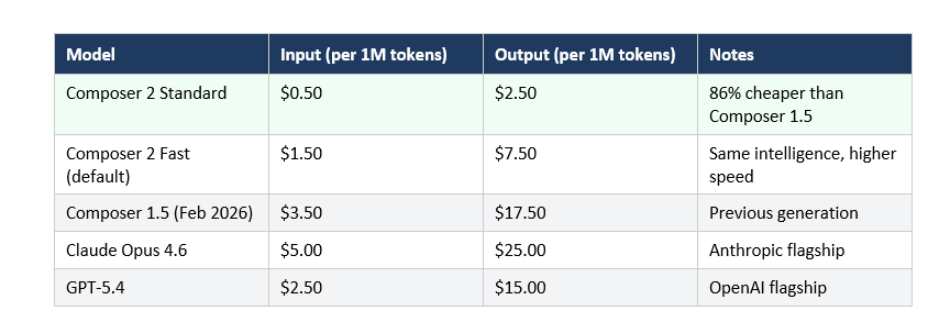 Composer 2 Standard is priced at $0.50 per million input tokens and $2.50 per million output tokens. The fast variant, which is now the default, costs $1.50 per million input tokens and $7.50 per million output tokens. Both variants are roughly 86% and 57% cheaper, respectively, than Composer 1.5.