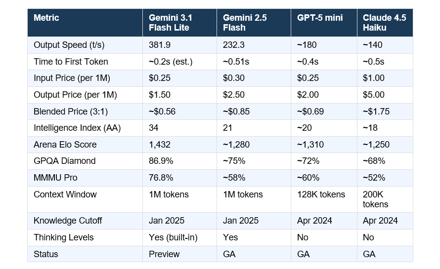 On output speed, 3.1 Flash Lite outpaces both: 381 t/s versus approximately 140 t/s for Claude 4.5 Haiku and approximately 180 t/s for GPT-5 mini. On output pricing, it's cheaper than both: $1.50/1M versus $5.00 for Haiku and $2.00 for GPT-5 mini. On intelligence benchmarks, 3.1 Flash Lite's Arena Elo of 1,432 leads its tier. The only advantage GPT-5 mini holds is GA status and tighter enterprise support.