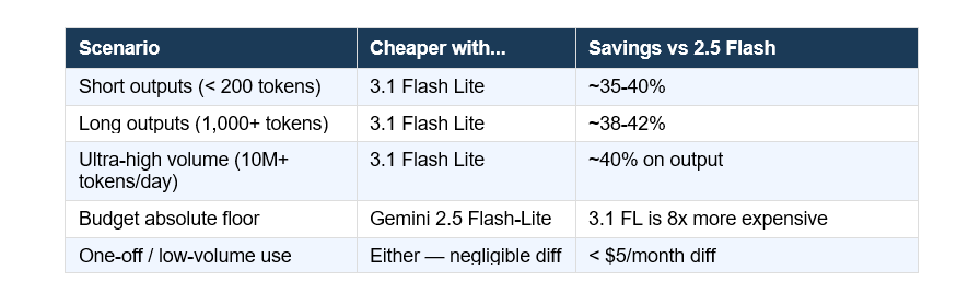 ⚠️ Contrarian point: The AI community is treating 3.1 Flash Lite like it killed 2.5 Flash-Lite. It didn't. For pure cost-per-token at high volume, 2.5 Flash-Lite at $0.40/1M output still wins by a wide margin. 3.1 Flash Lite is smarter and faster - but it's not cheaper than everything below it.
