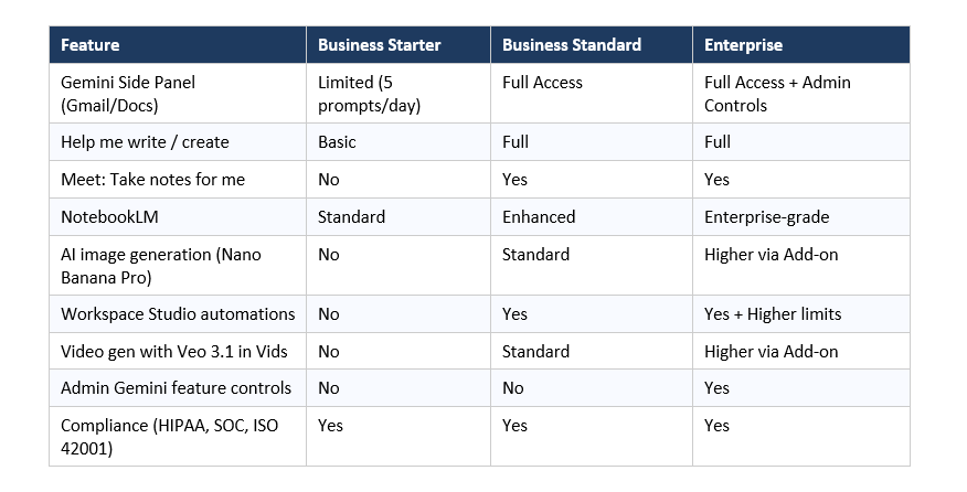 Yes. Since January 2025, Gemini AI features are included in Google Workspace Business Standard, Business Plus, Enterprise Starter, Enterprise Standard, and Enterprise Plus plans at no additional cost. Business Starter includes a limited version with restricted daily prompts. The AI Expanded Access add-on (available from March 2026) unlocks higher usage limits for advanced features.