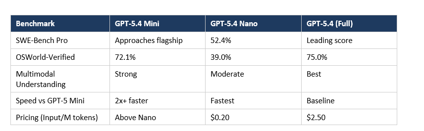 On OSWorld-Verified, GPT-5.4 Mini scored 72.1%, just below the flagship's 75.0% and above the human baseline of 72.4%. On SWE-Bench Pro, Mini approaches GPT-5.4's performance. GPT-5.4 Nano scored 52.4% on SWE-Bench Pro and 39.0% on OSWorld.