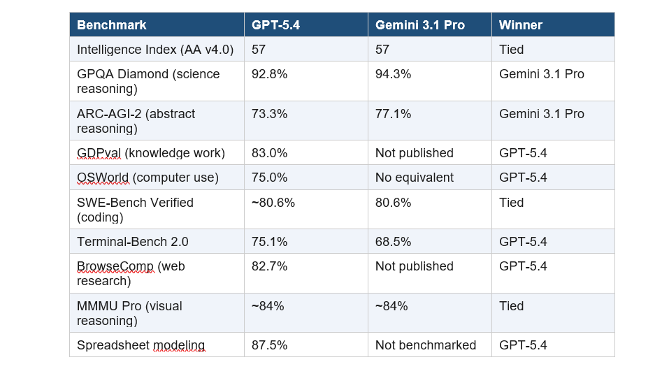 Neither model wins outright. GPT-5.4 leads on computer use (75% OSWorld), professional knowledge work (83% GDPval), and terminal tasks. Gemini 3.1 Pro leads on abstract reasoning (94.3% GPQA Diamond, 77.1% ARC-AGI-2) and costs about 20% less at standard rates. Both score identically at 57 on the Artificial Analysis Intelligence Index as of March 2026.