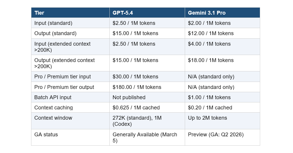 Where Gemini genuinely wins on cost: the Batch API at $1.00/$6.00 and context caching at $0.20/M make high-volume, non-realtime workloads significantly cheaper than anything GPT-5.4 offers right now.