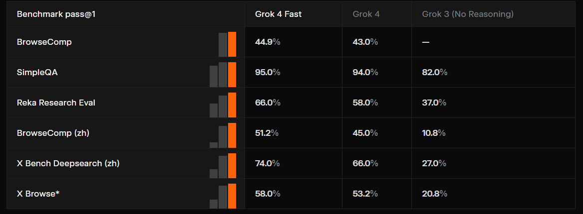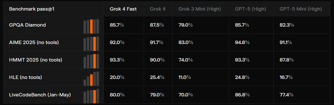 Despite being optimized for speed and cost, Grok-4-Fast posts frontier-class benchmark scores: