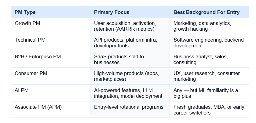 The main types are: Technical PM (works on platform and API products, best for engineers), Growth PM (owns metrics like activation and retention, best for marketers and analysts), B2B Enterprise PM (sells through sales teams, great for consultants and BAs), Consumer PM (mass-market products, great for UX and consumer marketing backgrounds), and AI PM (fastest growing in 2026, building AI-powered features). For most career switchers, B2B SaaS PM or Growth PM at a startup is the most achievable first role. APM programs are the structured on-ramp.