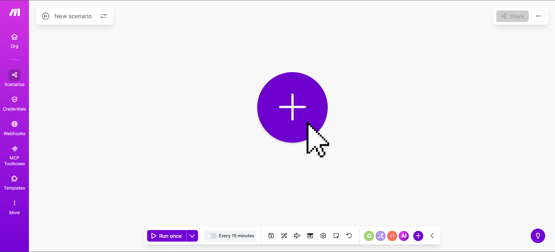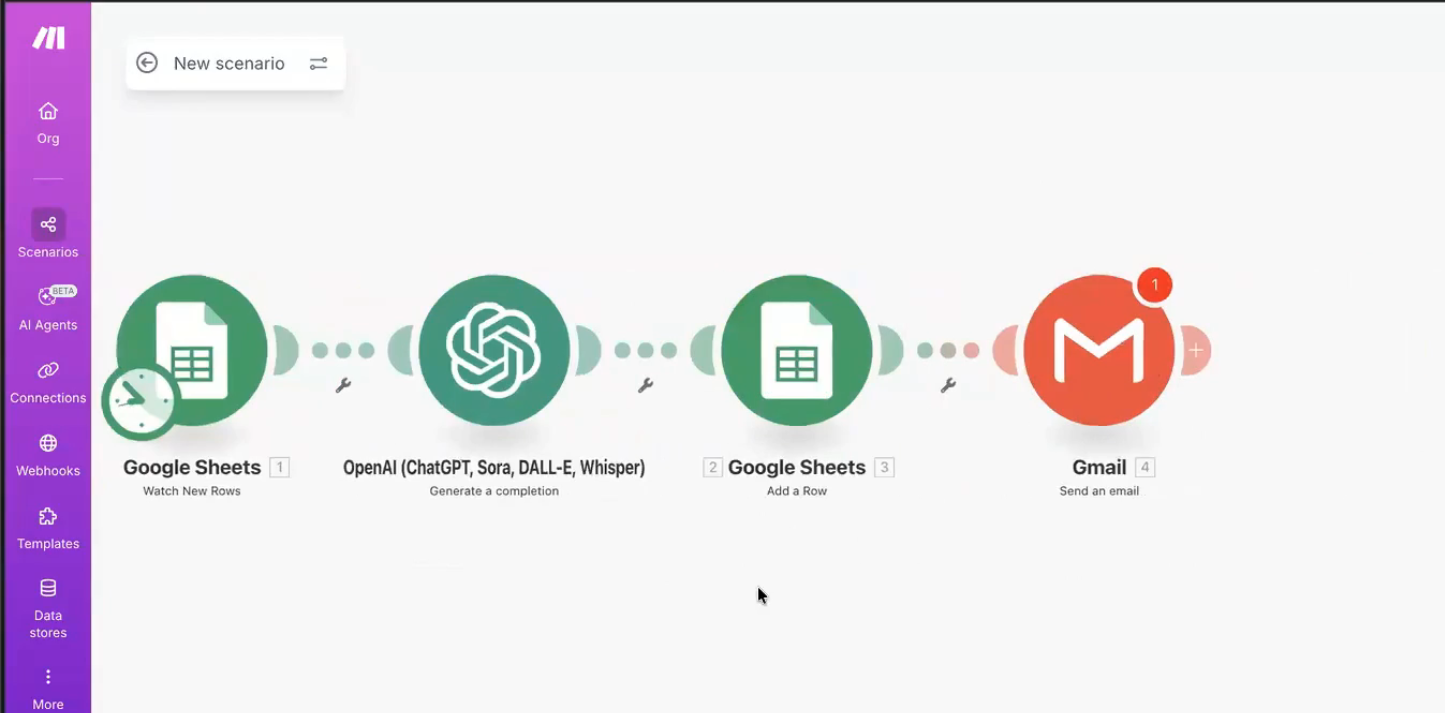 Log into Make.com. Click on Scenarios in the left sidebar, then hit Create a Scenario. You'll land on a blank canvas — this is where the magic happens.