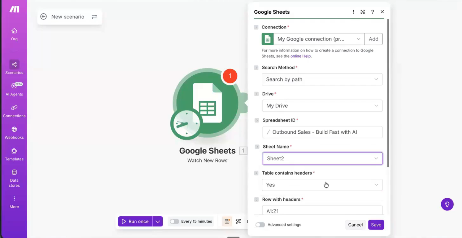 Connect your Google account, select your spreadsheet (in the demo, this is an Outbound Sales sheet), and choose the right tab. Set it to watch all rows.