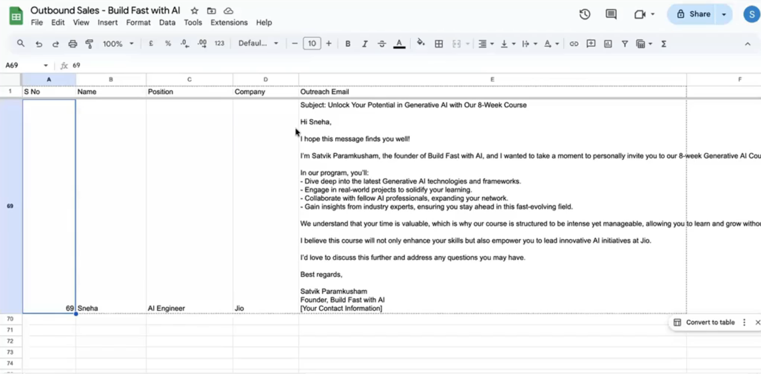 Your sheet should have columns for: Name, Designation, Company — these are what ChatGPT will use to personalize each email.