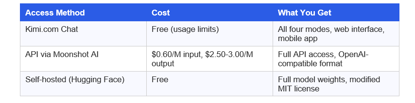 Kimi K2.5 has three access tiers, and the pricing structure is one of its strongest selling points.