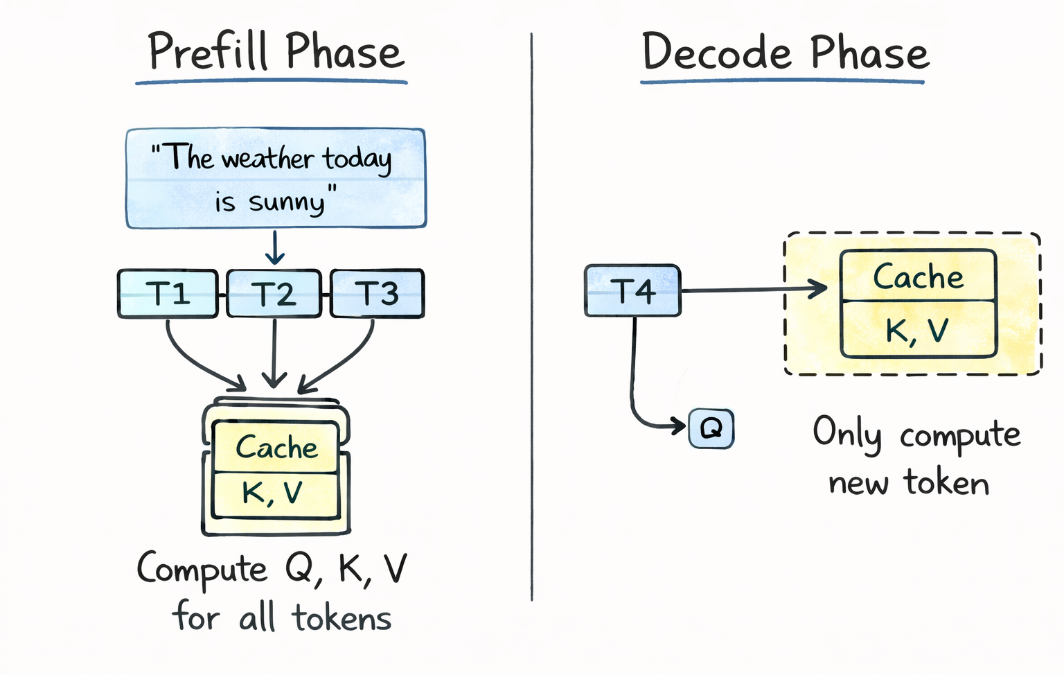 Decode phase: For each subsequent token, the model only needs to compute Q, K, and V for the single new token. It retrieves all previous K and V vectors from the cache, computes attention between the new query and all cached keys, and produces the output. The new K and V vectors are then appended to the cache for the next step.