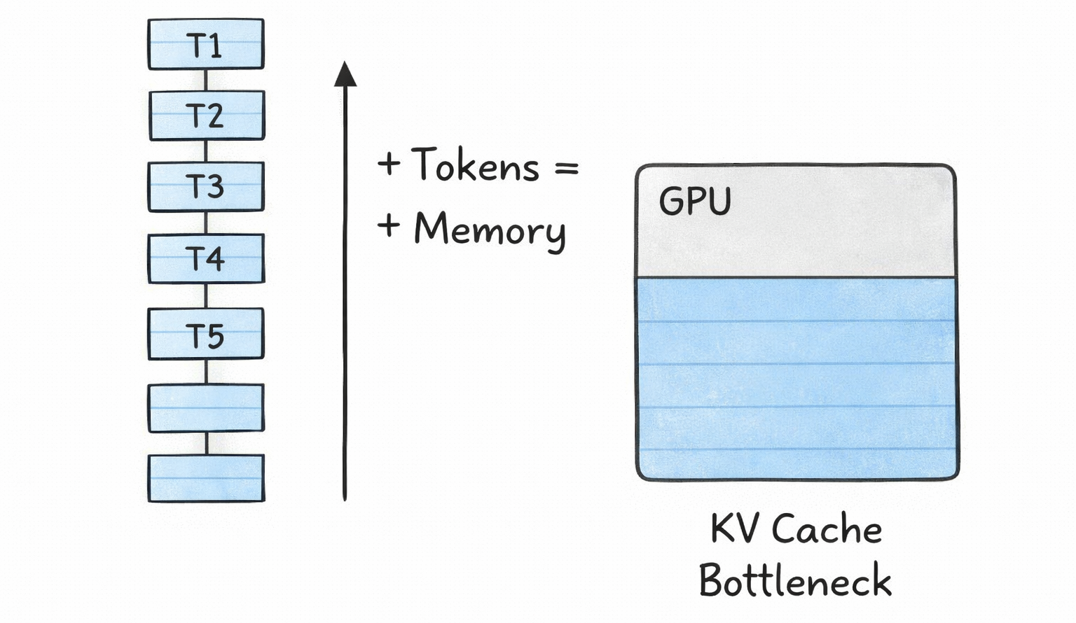 Memory pressure. As context windows grow (GPT-4 supports 128K tokens, Gemini supports up to 1M tokens), the KV cache grows linearly with sequence length. This directly limits how many concurrent users you can serve and how long your context windows can be. Every additional token in every active request costs memory.