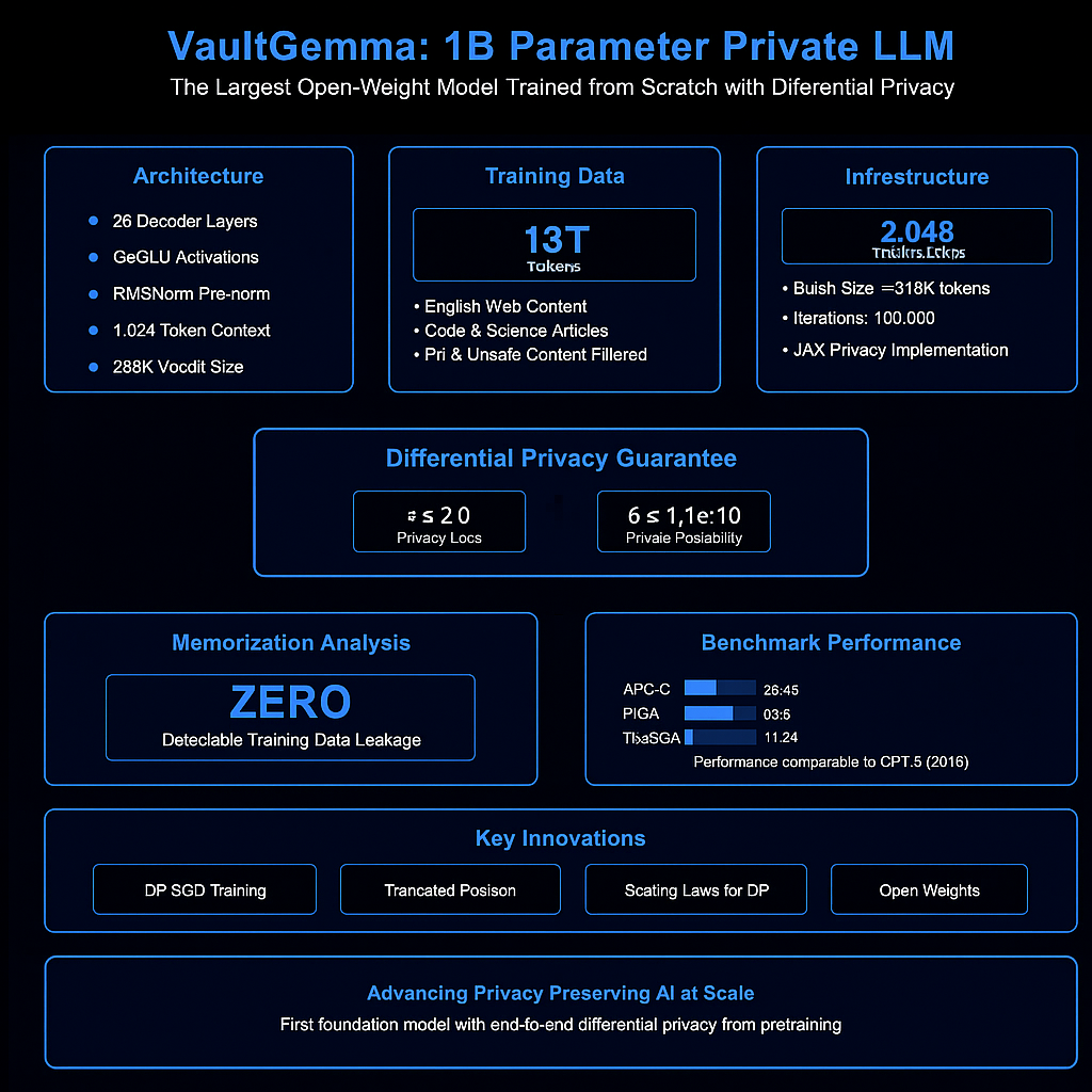 Google DeepMind and Google Research have released VaultGemma 1B, a 1-billion-parameter model from the Gemma family, trained from scratch with differential privacy.