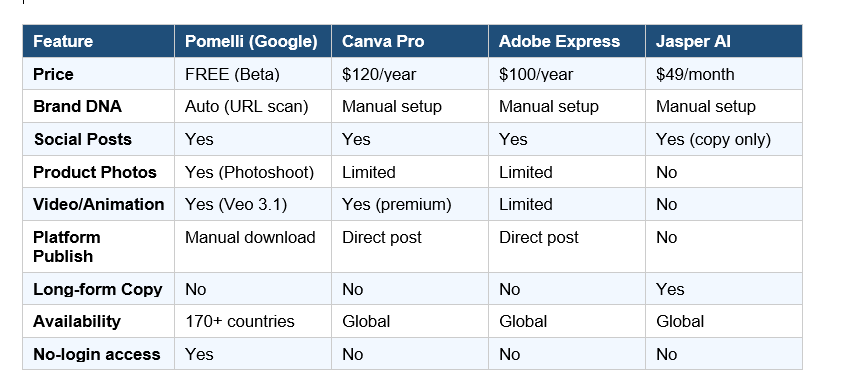 To put this in dollar terms: Pomelli saves you $120 to $180 per year compared to Canva Pro or Adobe Express - and includes studio-quality product photography that neither competitor offers at any price tier.