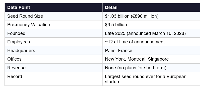 AMI Labs raised $1.03 billion (approximately €890 million) in a seed round at a $3.5 billion pre-money valuation, announced on March 10, 2026. The round was co-led by Cathay Innovation, Greycroft, Hiro Capital, HV Capital, and Bezos Expeditions. Additional backers include NVIDIA, Samsung, Temasek, Toyota Ventures, Mark Cuban, and Eric Schmidt.