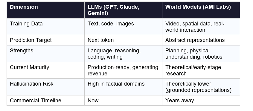 And there's a practical reality: LLMs are already in production at scale, generating billions in revenue, improving rapidly. World models are theoretical. AMI Labs has no product and no revenue timeline.